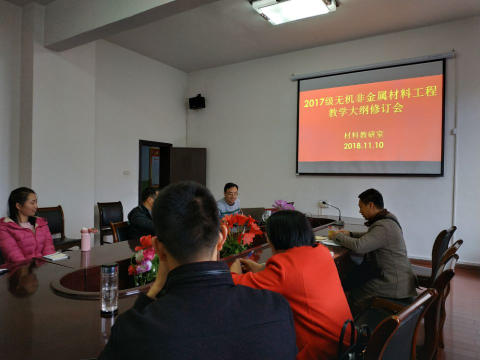 2018年11月10日,材料教研室所有老师顶着雷电交加,倾盆大雨,克服重重困难,利用周六休息时间,历时一天,在公司会议室召开2017级无机非金属材料工程校级特色本科专业教学大纲修订会,陈林副经理,向芸副书记出席会议,教研室主任宋杰光博士主持。