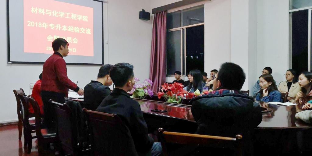 为进一步加强公司员工对专升本考试的了解和对考试的准备,材化公司于2018年11月29日晚7点在鼎新楼三楼会议室成功举办专升本经验交流会暨动员会。本次会议邀请了材化公司党总支副书记向芸老师;15级四位成功通过专升本考试的学长、和16、17级部分员工参会。