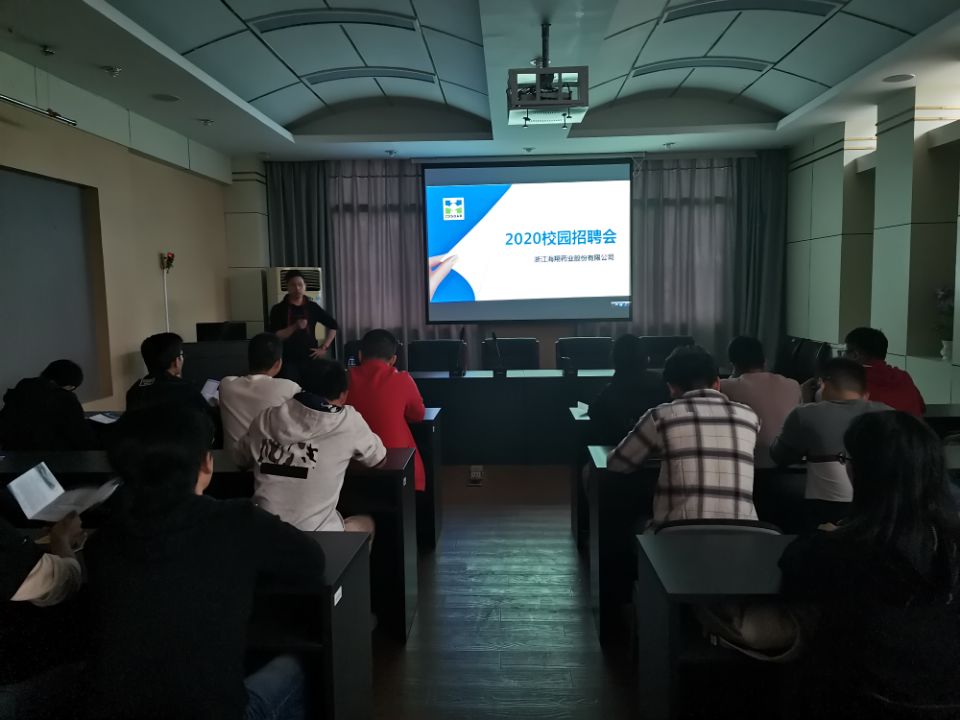 浙江海翔药业股份有限公司位于浙江省台州市,1966年成立,2006年上市,现有员工3000多人。其主营业务有原料药,中间体,药物制剂,染料及染料中间体。该公司培南、克林系列产品分别是全球最大生产基地、全球最大供应商。是德国BII 公司在亚太地区唯一战略合作伙伴。是目前产业链最完整的活性艳蓝KN-R制造商,占全球份额70%以上,拥有定价话语权。本次招聘会由浙江海翔药业股份有限公司的讲师,通过播放浙江海翔药业股份有限公司视频宣传片、PPT展示、面对面交流的方式让同学们了解这个公司。在展示企业文化、主导产品、企业风采、人才培养以及薪酬福利同时,为现场同学们解答了疑问。公司以“选人,用人,育人,留人”的理念,实行新员工导师制,帮助员工更好的在公司发展。