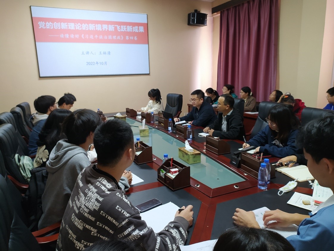 最后,陈林书记做总结。他说,在党的二十大即将召开之际,《习近平谈治国理政》第四卷中英文版面向海内外公开发行,这是党和国家政治生活中的一件大事。《习近平谈治国理政》第四卷体系严整、内涵丰富、博大精深,集中展现了马克思主义中国化的最新成果,是学习习近平新时代中国特色社会主义思想的权威教材。理论创新每前进一步,理论武装就要跟进一步。我们要大力弘扬理论联系实际的马克思主义优良学风,学好用好《习近平谈治国理政》第四卷,切实做到学思用贯通、知信行合一,将学习成效转化为坚定捍卫“两个确立”、坚决做到“两个维护”的实际行动。全院师生要用高涨的学习热潮迎接党的二十大的召开。