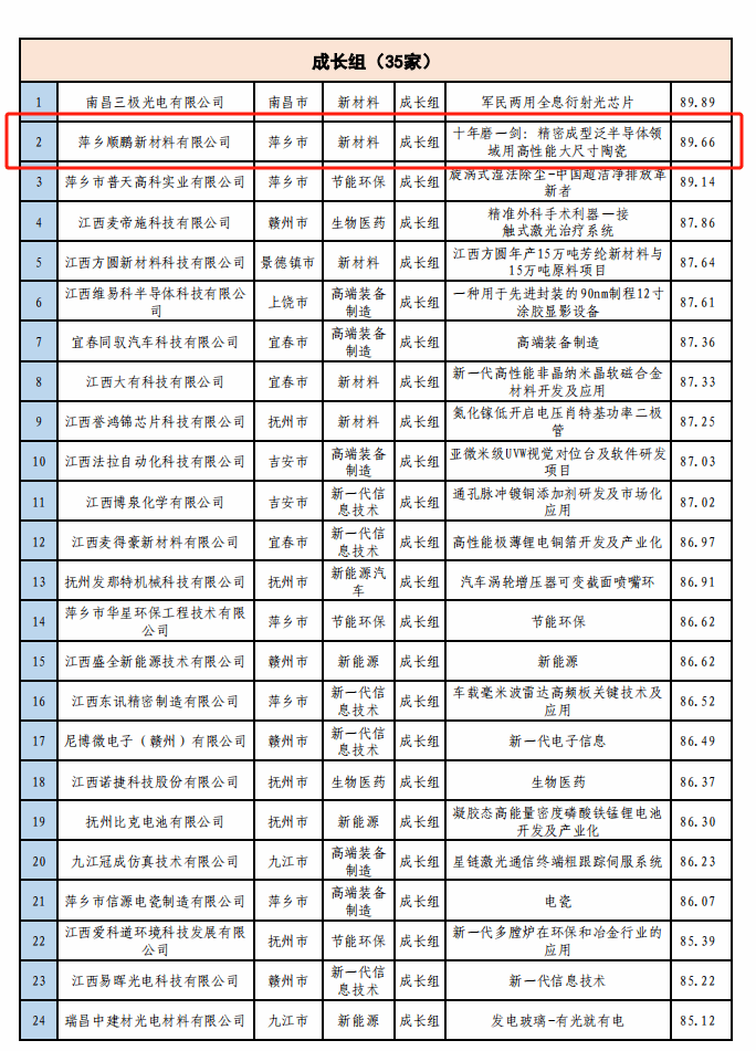 8月28日,由江西省科技厅、萍乡市人民政府主办,萍乡市科技局承办的第十三届中国创新创业大赛(江西赛区)决赛于在萍乡进行。大赛采取线下路演答辩评审方式,共14位来自中国创新创业大赛专家库中的评委参加评审工作。来自新一代信息技术、生物医药、高端装备制造、新材料、新能源、新能源汽车、节能环保7个战略性新兴产业领域的21家初创组企业、35家成长组企业轮番登场,进行激烈角逐。最终,由公司曾招余波博士及无机非金属材料22级员工刘昀萱等作为答辩人的萍乡市顺鹏新材料有限公司项目:“十年磨一剑:精密成形泛半导体领域用高性能大尺寸陶瓷”,以89.66分取得大赛成长组第二名的好成绩,荣获省二等奖。据悉,此前省级复赛已于8月19日至21日期间在萍乡进行,共有109家企业进入到复赛环节。顺鹏新材以成长组新材料产业第一名的好成绩顺利进入决赛。