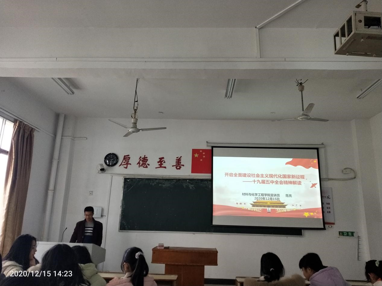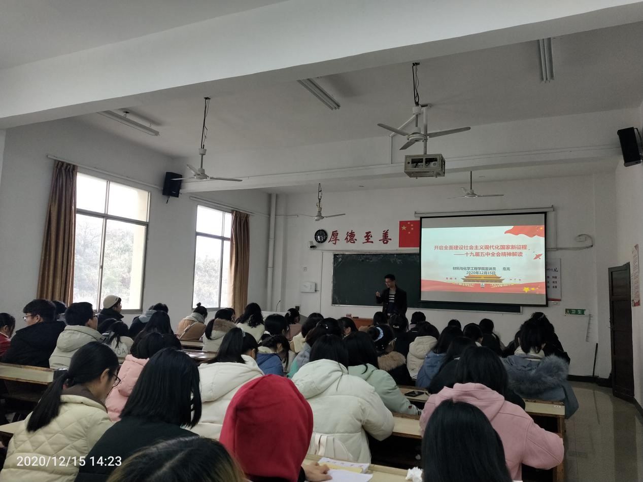 为深刻领会党的十九届五中全会精神的实质和丰富内涵,推动学习活动深入扎实开展,2020年12月15日14:20,材料与与化学工程公司在鼎新楼2313传达学习贯彻党的十九届五中全会精神宣讲会。本次宣讲会由辅导员危亮老师主讲,公司全体员工党员、入党积极分子参加。