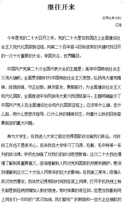 两份优秀作品分别来自化学员工党支部20级周雅婷同学和江浩同学,他们用铿锵有力的文字语言表达了在新征程中不断奋斗的决心和毅力。