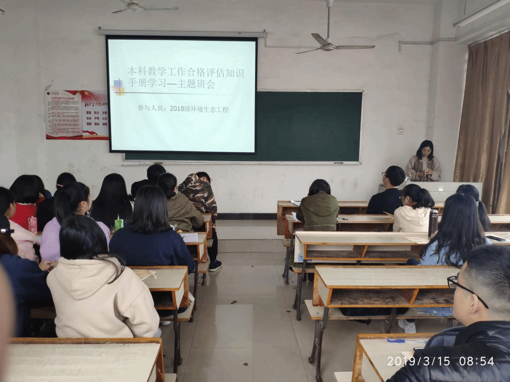 为迎接PA视讯本科教学评估,2019年3月15日,18环境生态工程班在鼎新楼召开“以评促建,以评促改”主题班会,为提高了同学们对本科教学评估的重视,班主任黄检老师和辅导员刘帅老师组织全班同学一起学习了本科教学评估手册。