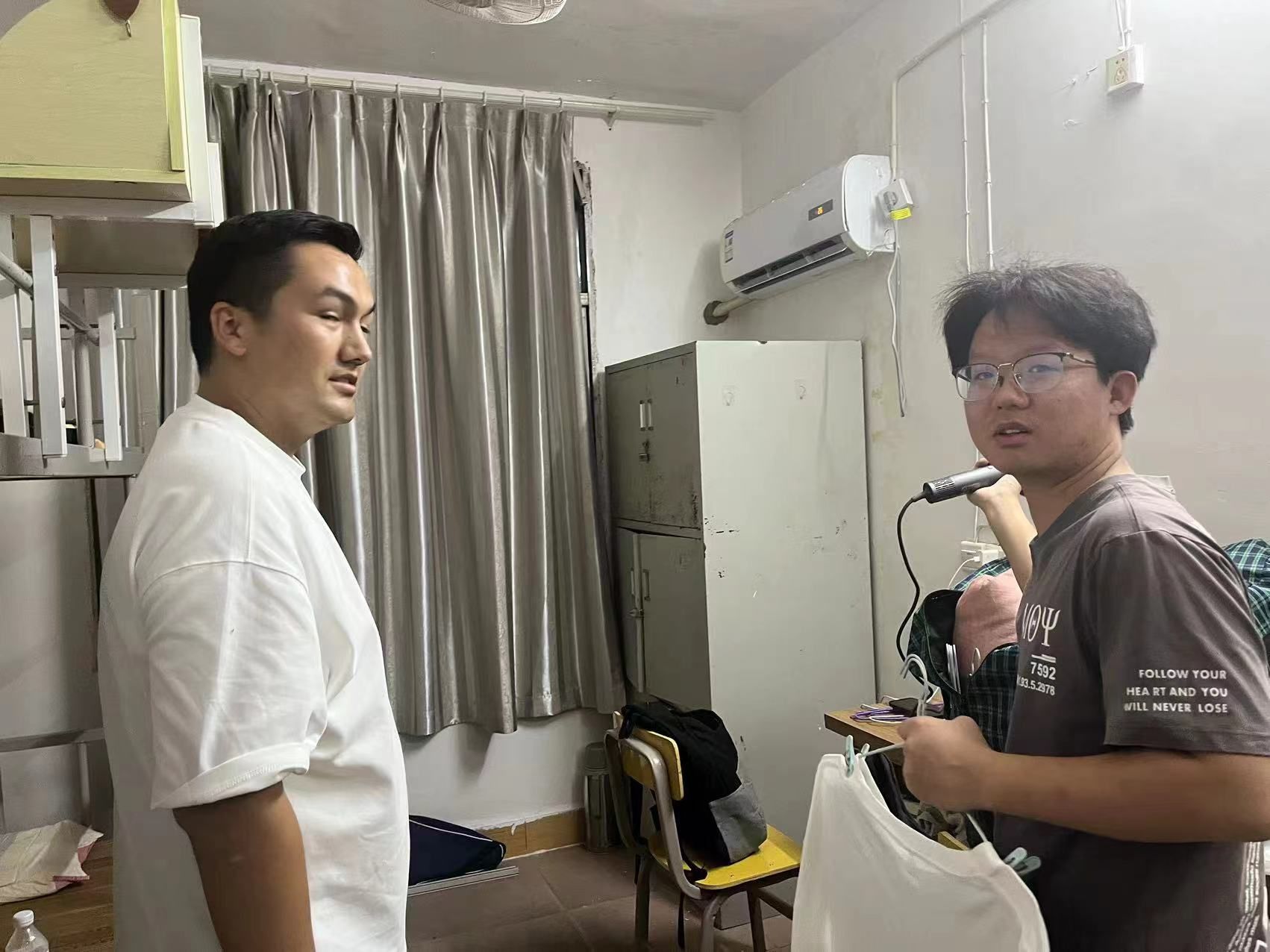9月7日晚,在PA视讯的校园里,一场温馨的师生互动正在员工寝室中上演。来自新疆的阿卜杜萨拉木老师带着满满的关怀与热情,走进员工寝室,为同学们带来了别样的温暖与感动。